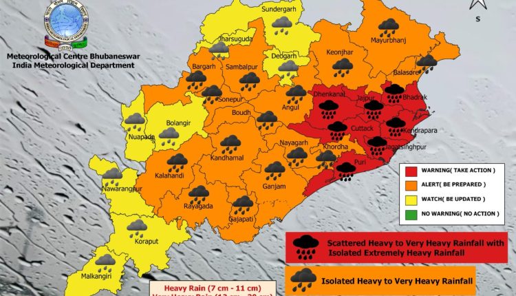 ଭୁବନେଶ୍ବର: ଗତକାଲି ପଶ୍ଚିମ ମିଆଁମାର ନିକଟ ରେ ରହିଥିବା ଘୂର୍ଣ୍ଣିବଳୟ କ୍ଷେତ୍ର ଆଜି ଉତ୍ତର ବଙ୍ଗୋପସାଗର ରେ ସକାଳେ ଲଘୁଚାପ ରେ ପରିଣତ ହୋଇଛି। ଏହି କ୍ଷେତ୍ର ଆସନ୍ତା ୨୪ ଘଣ୍ଟା ରେ ପଶ୍ଚିମ ଉତ୍ତର ପଶ୍ଚିମ ଦିଗରେ ଅଗ୍ରସର ହୋଇ ଡିପ୍ରେଶନ୍ ର ରୂପ ନେଇପାରେ। ଆସନ୍ତା ୨୪ ଘଣ୍ଟା ମଧ୍ୟରେ ୦୭ ଟି ଜିଲ୍ଲା ରେ ରେଡ୍ ଆଲର୍ଟ ଜାରି କରାଯାଇଛି ପୁରୀ, ଜଗତସିଂହପୁର, କେନ୍ଦ୍ରାପଡା, କଟକ,ଭଦ୍ରକ, ଯାଜପୁର, ଢେଙ୍କାନାଳ ଜିଲ୍ଲା ରେ ପ୍ରବଳ ରୁ ଅତି ପ୍ରବଳ ବର୍ଷା(୭-୨୦ସେମି) ସହ ଅଳ୍ପ କିଛି ଅଞ୍ଚଳ ରେ ଅତ୍ୟନ୍ତ ପ୍ରବଳ ବର୍ଷା (୨୦ସେମି+) ସମ୍ଭାବନା ରହିଛି । ମୟୂରଭଞ୍ଜ, କେଉଁଝର, ବାଲେଶ୍ଵର, ଖୋର୍ଦ୍ଧା, ଗଜପତି, ଗଞ୍ଜାମ, ନୟାଗଡ଼, ଅନୁଗୁଳ, ସମ୍ବଲପୁର, ସୋନପୁର, ବରଗଡ଼, ବୌଦ୍ଧ,କଳାହାଣ୍ଡି, କନ୍ଧମାଳ, ରାୟଗଡ଼ା ଜିଲ୍ଲା ର କିଛି ସ୍ଥାନ ରେ ପ୍ରବଳ ରୁ ଅତି ପ୍ରବଳ ବର୍ଷା (୭-୨୦ସେମି) ବର୍ଷା ସମ୍ଭାବନା ରହିଛି। ରାଜ୍ୟ ର ଅନ୍ୟ ସମସ୍ତ ଅଞ୍ଚଳ ରେ ପ୍ରବଳ ବର୍ଷା (୭-୧୧ସେମି)ସମ୍ଭାବନା ରହିଛି।