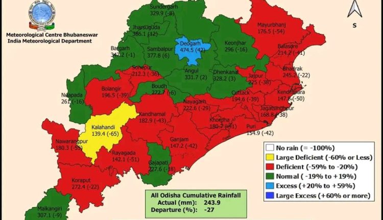 ଭୁବନେଶ୍ବର: ଜୁନ ୦୧ ରୁ ଜୁଲାଇ ୧୩ ତାରିଖ ମଧ୍ୟରେ ରାଜ୍ୟ ରେ ସ୍ଵାଭାବିକ ଭାବେ ୩୩୪.୪ମିମି ବର୍ଷା ହେବାକଥା କିନ୍ତୁ ଏହି ସମୟ ରେ ୨୪୩.୯ମିମି ବର୍ଷା ହୋଇଛି । ଯାହା ସ୍ଵାଭାବିକ ଠାରୁ ୨୭% କମ୍ ବର୍ଷା। ଏହି ସମୟ ରେ କଳାହାଣ୍ଡି ରେ ୬୫% କମ୍ ବର୍ଷା ହୋଇଥିବା ବେଳେ, ୧୭ ଜିଲ୍ଲା ରେ କମ୍ ବର୍ଷା ହୋଇଛି, ୧୧ ଟି ଜିଲ୍ଲା ରେ ସ୍ଵାଭାବିକ ବର୍ଷା ହୋଇଛି କେବଳ ଦେବଗଡ଼ ଜିଲ୍ଲା ରେ ସ୍ଵାଭାବିକ ଠାରୁ ଅଧିକ ବର୍ଷା ହୋଇଛି। ଉପକୂଳ ଓଡ଼ିଶା ର ସମସ୍ତ ଜିଲ୍ଲା ଓ ଆଖପାଖ ଜିଲ୍ଲା ରେ କମ୍ ବର୍ଷା ଯୋଗୁଁ କୃଷି କାର୍ଯ୍ୟ ଆଗେଇ ପାରିନାହିଁ।