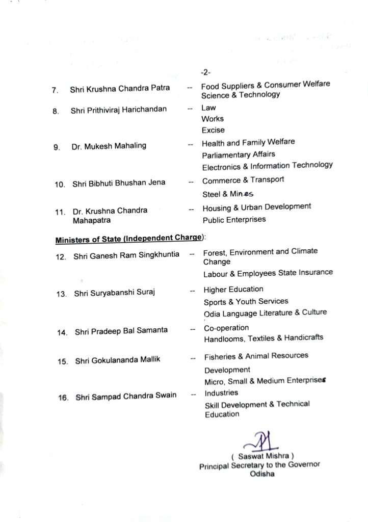 ଭୁବନେଶ୍ବର: ରାଜ୍ୟରେ ନୂଆ ସରକାରରେ ମନ୍ତ୍ରୀଙ୍କୁ ବିଭାଗ ବଣ୍ଟନ ହେଲା। ନିଜ ପାଖରେ ଗୃହ, ସାଧାରଣ ପ୍ରଶାସନ, ସୂଚନା ଓ ଲୋକସମ୍ପର୍କ, ଜଳ ସମ୍ପଦ, ଯୋଜନା ଓ ସଂଯୋଜନ ବିଭାଗ ରଖିଲେ ମୁଖ୍ୟମନ୍ତ୍ରୀ। ଉପମୁଖ୍ୟମନ୍ତ୍ରୀ କେ.ଭି. ସିଂହ ଦେଓଙ୍କୁ ମିଳିଲା କୃଷି ଓ କୃଷକ ସଶକ୍ତୀକରଣ, ଶକ୍ତି ବଭାଗ।ଉପମୁଖ୍ୟମନ୍ତ୍ରୀ ପ୍ରଭାତୀ ପରିଡ଼ା ପାଇଲେ ମହିଳା ଓ ଶିଶୁ ବିକାଶ, ମିଶନ ଶକ୍ତି, ପର୍ଯ୍ୟଟନ। ସେହିପରି ଅନ୍ୟମାନଙ୍କ ମଧ୍ୟରେ ଅଛନ୍ତି..