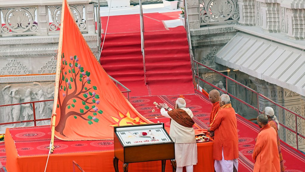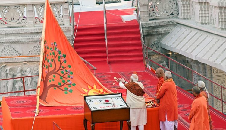 ଅଯୋଧ୍ୟା: ଅଯୋଧ୍ୟାର ଶ୍ରୀରାମଙ୍କ ମନ୍ଦିରରେ ଉଡ଼ିଛି ଧର୍ମଧ୍ୱଜା। ଆଜି ଶୁଭ ମୁହୂର୍ତ୍ତରେ ବିରାଟକାୟ ଧର୍ମଧ୍ୱଜାଙ୍କୁ ବିଧିବଦ୍ଧ ଭାବେ ମନ୍ଦିରର ଚୂଡ଼ାରେ ସ୍ଥାପନ କରିଛନ୍ତି ପ୍ରଧାନମନ୍ତ୍ରୀ ନରେନ୍ଦ୍ର ମୋଦି। ଏହି ଅବସରରେ ମୋଦୀ କହିଛନ୍ତି ଧର୍ମଧ୍ବଜା ଭାରତୀୟ ସଭ୍ୟତାର ପୁନଃ ଜାଗରଣର ପ୍ରତୀକ। ଏହା ହେଉଛି ପ୍ରତିଶ୍ରୁତି ପାଳନର ପ୍ରତୀକ।